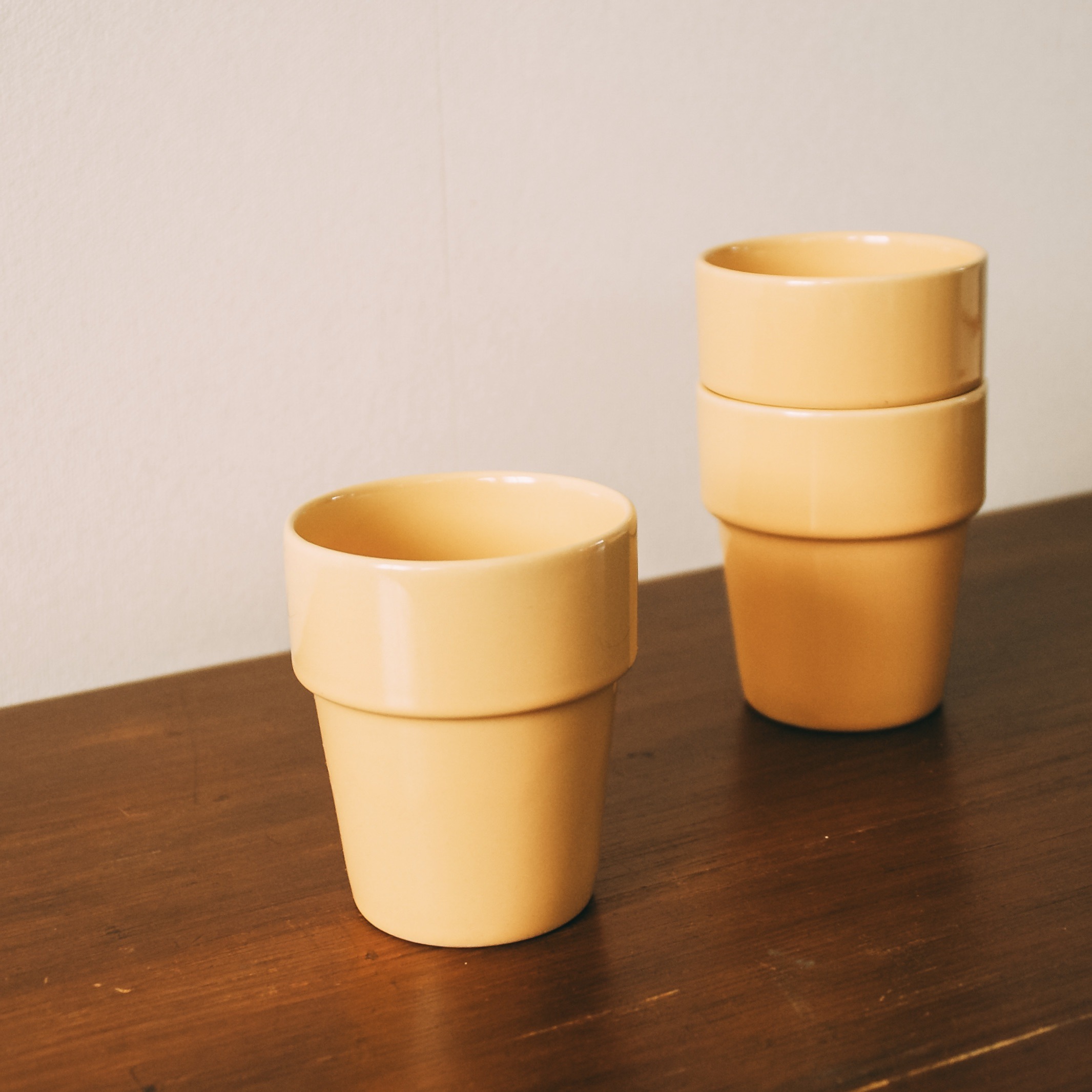 A set of three stackable coffee tumblers in a soft yellow hue. Gentle in color, bringing a subtle warmth to your table.